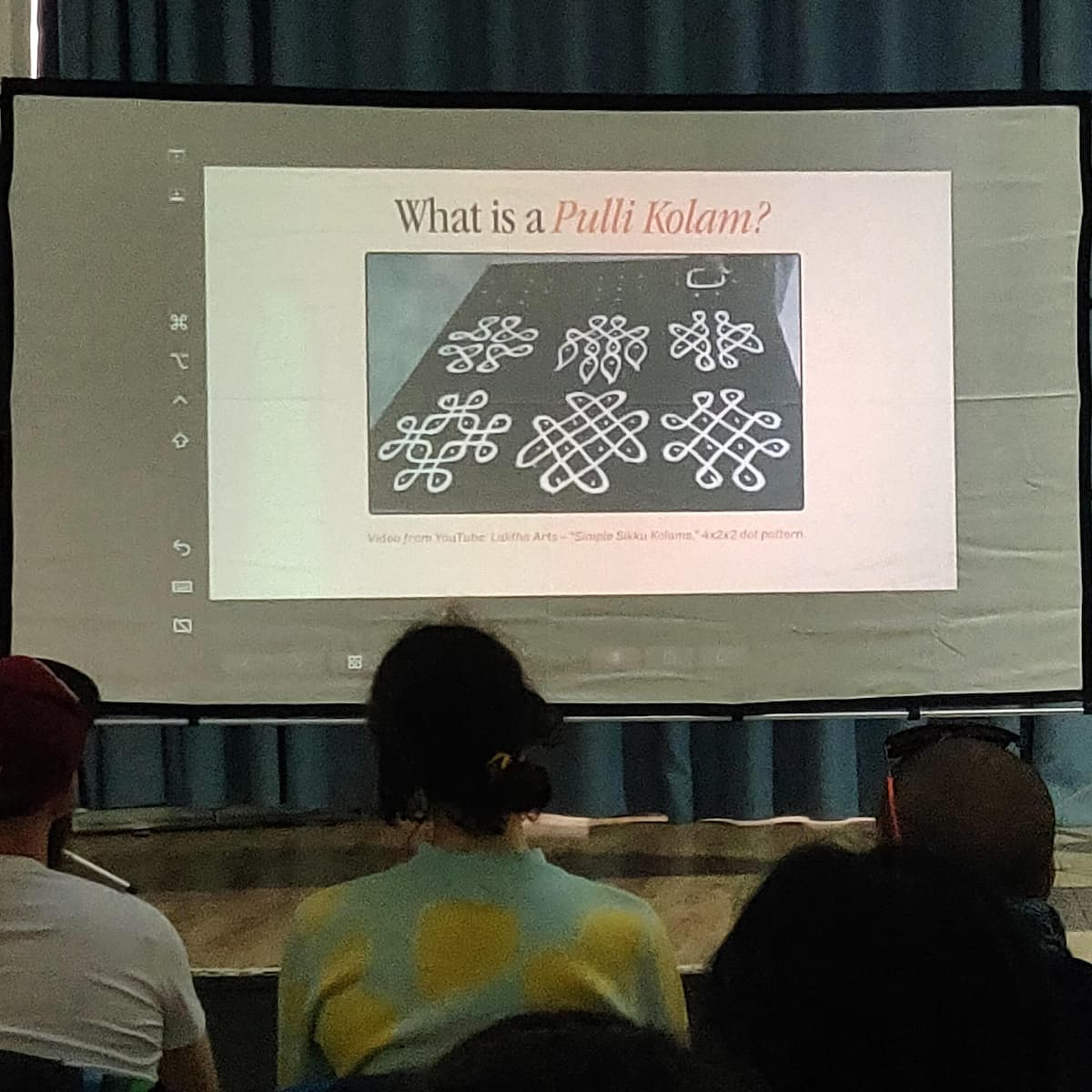 Subsequent meetups would focus on Andean khipu, kambi kolam. Andean khipu: knotted-cord systems for recording and communicating information; kambi kolam: South Indian threshold patterns, a single unbroken line drawn in rice flour at dawn. The series refuses the usual arc: expert explains, novices receive. Instead it gives people space to work out what “algorithmic pattern” can mean, by changing the materials/practice and letting the format teach.