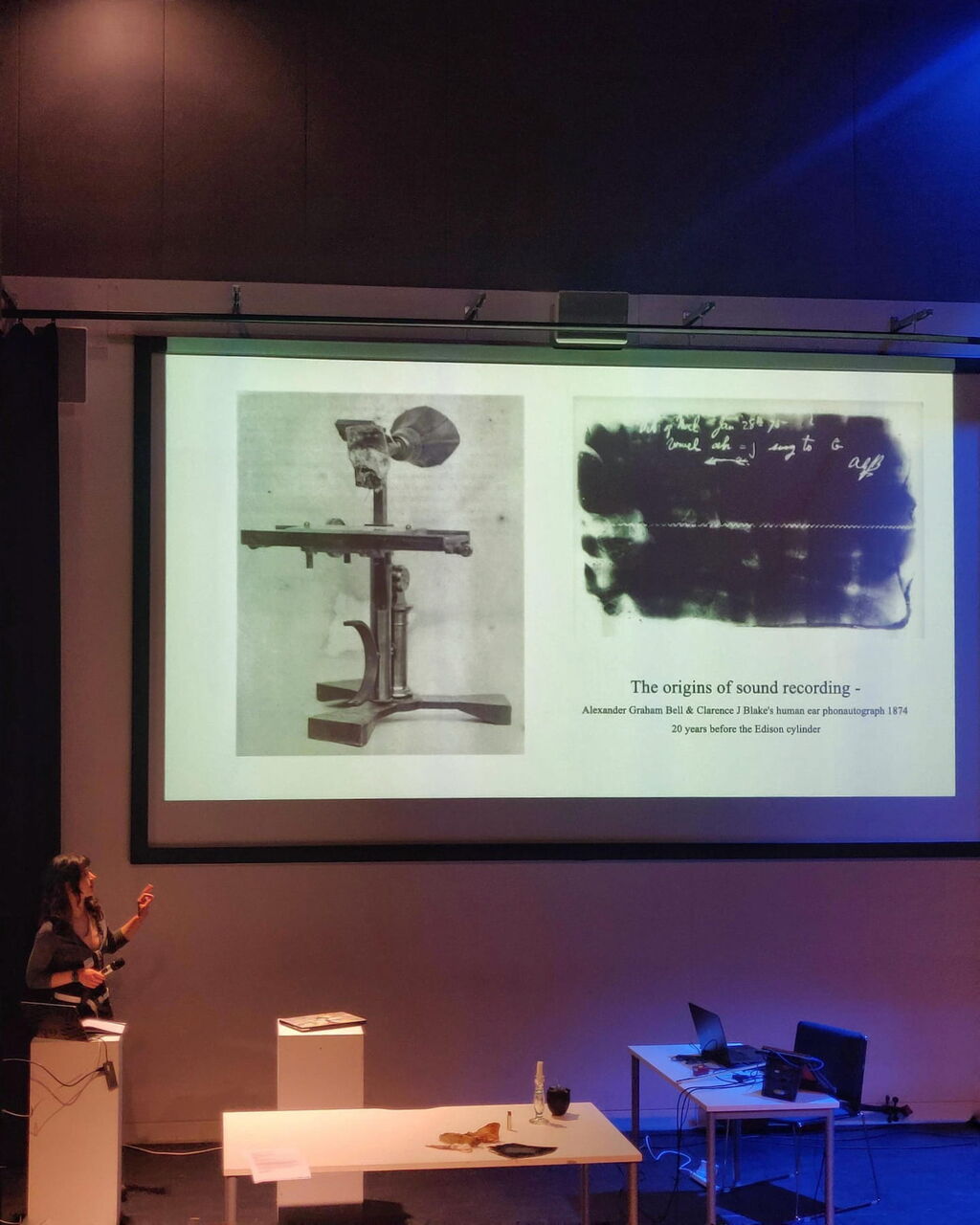 Glass artist Emma Mitchison discusses Bell and Blake's human ear phonautograph (1874) at Dorkbot Manchester #7, May 2025. The device, which used a real human ear to trace sound waves onto smoked glass, predated Edison's cylinder by twenty years.
