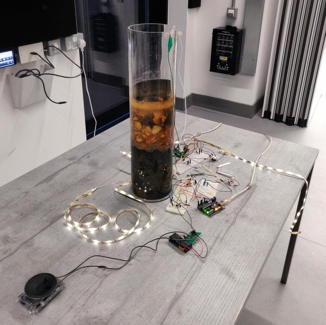 Twice a year, more or less, Manchester runs this small ritual: a university room briefly becomes a temporary public for process – people who didn’t arrive as a public becoming one through shared witnessing. You arrive after work. The doors open early, but not too early – enough for the awkward pre-talk hovering, late enough that it still feels like an after-hours intrusion into institutional space. In the plate-glass modernity of SODA Manchester Metropolitan University’s School of Digital Arts , the room is lit like a demo: projector glow, a long table of ambiguous objects, cables snaking, laptops waking up. The first ten minutes are calibration. Objects as tuning forks. People orbit the demos; quick scan for familiar faces, slow scan for who might become familiar later.