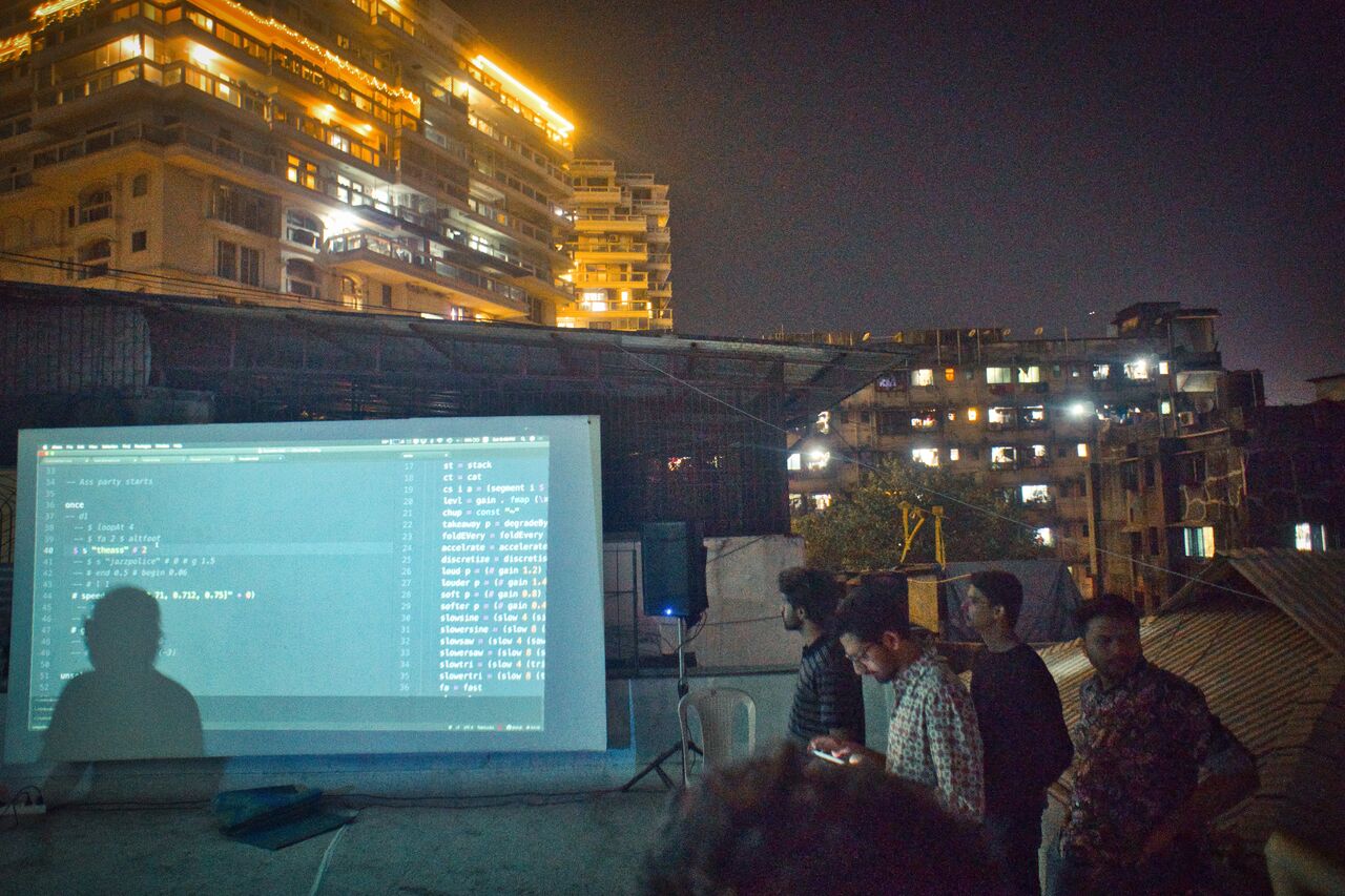 Live coding on a rooftop, Chuim Village, Bandra, Mumbai, December 2019. Photo: Dhanya Pilo / Abhinay Khoparzi. CC BY-SA 4.0