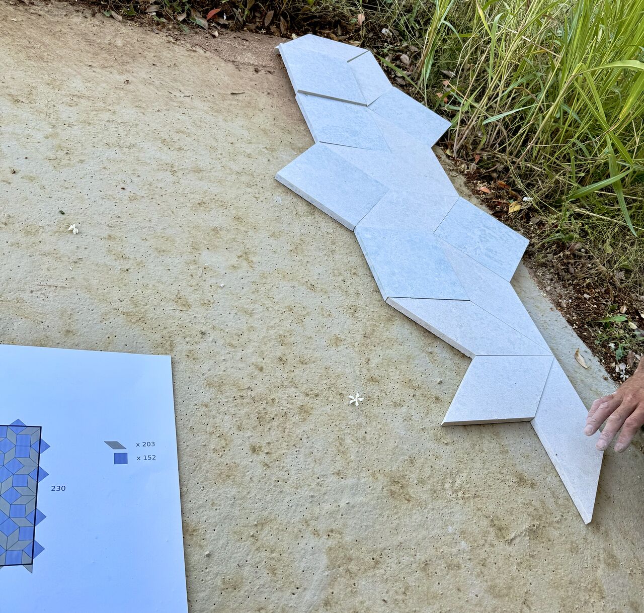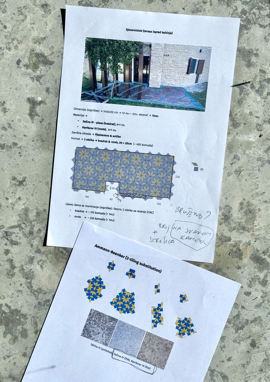 While renovating FoAM’s new studio in Istria, we were looking for interesting ways to resurface a terrace using local limestone. Discussing possibilities with Kamen Pazin, who quarry and cut stone, they mentioned their CNC waterjet, able to cut stone into any shape. Having read about the Spectre monotile, we were keen to try – if we could find a stonemason willing to work with the tiling. Davor Baf accepted the challenge. When we showed Davor the sketch, he expected it would be “a simple matter of rotating each piece until it fit”. This assumption led to a months-long exercise in ad-hoc combinatorics.